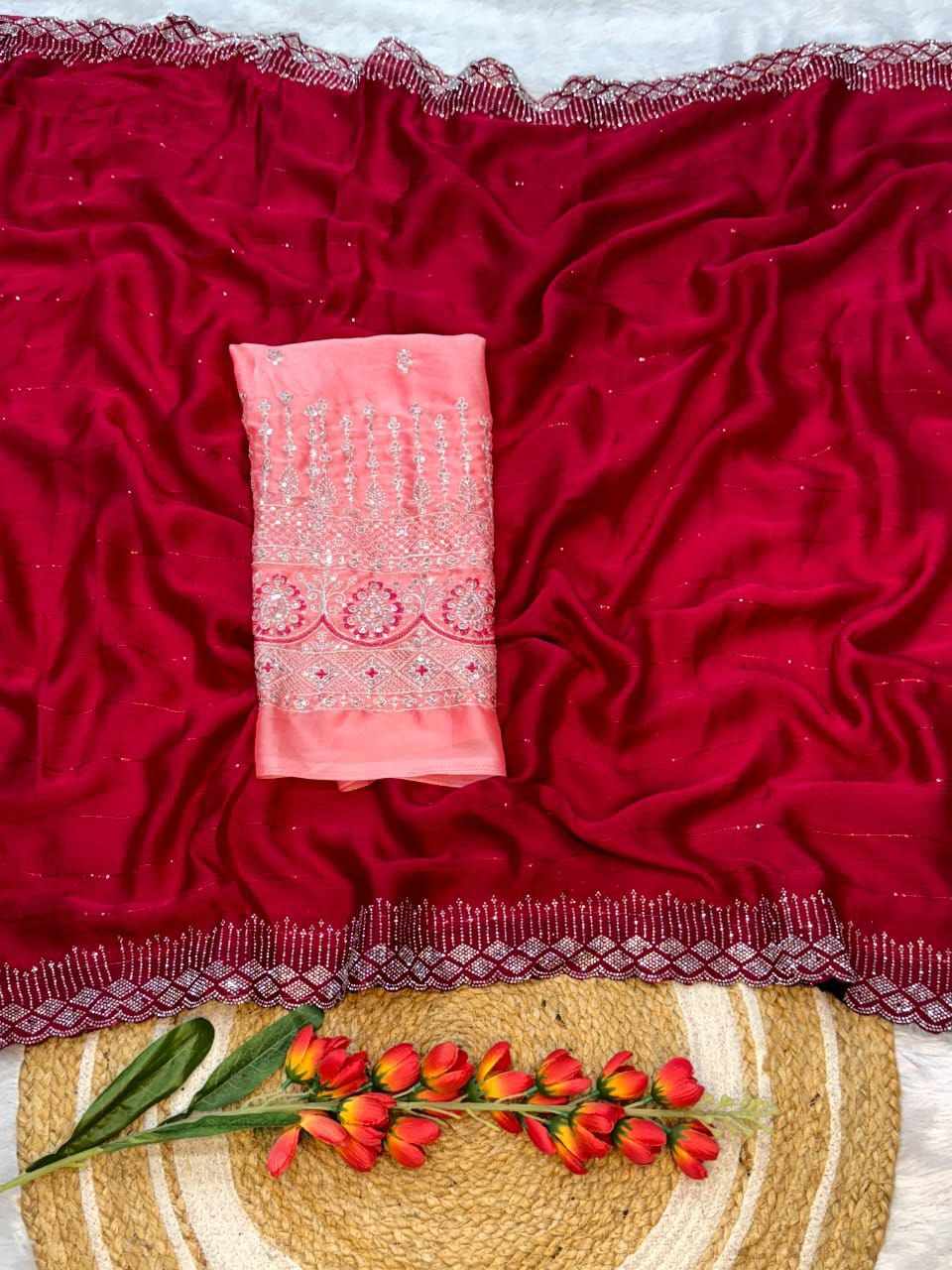 RC chiffon sequins red beautiful saree